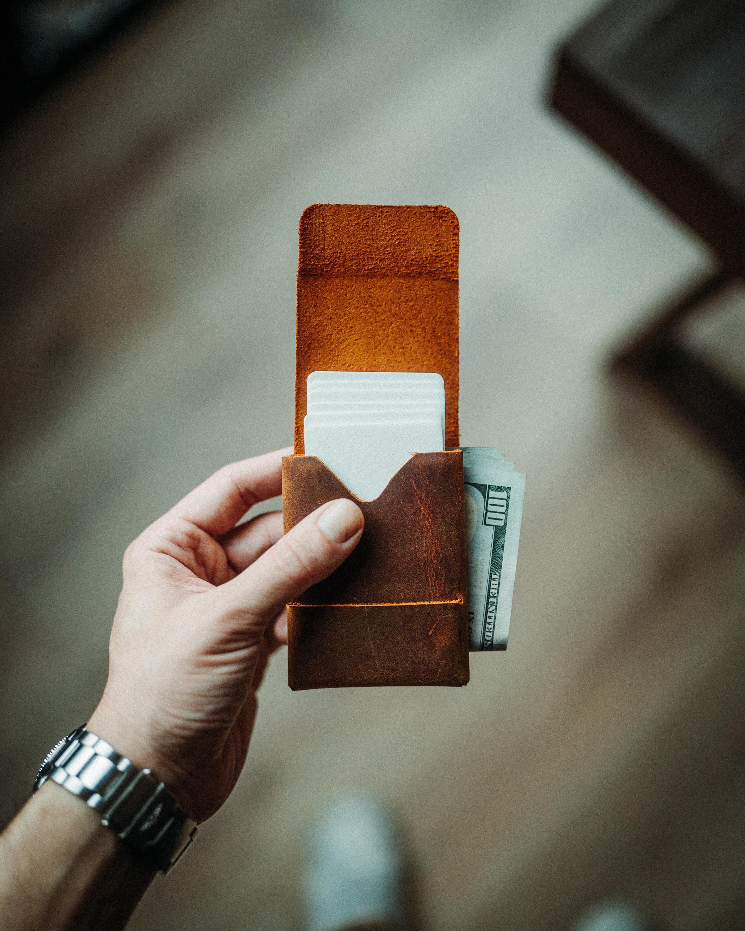 Handmade from durable leather that develops a beautiful patina over time, this larger version offers more space while keeping the same slim and minimalist profile.