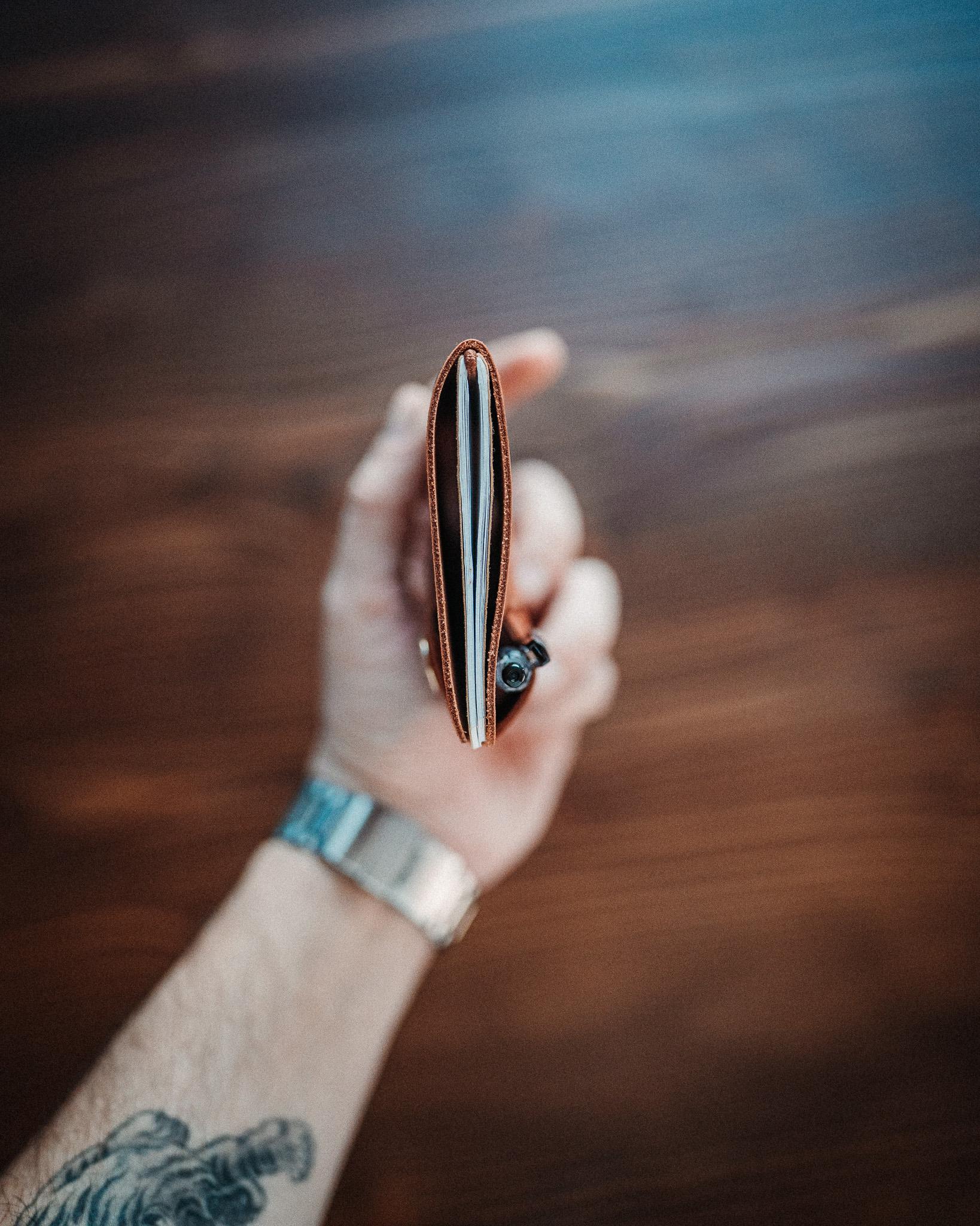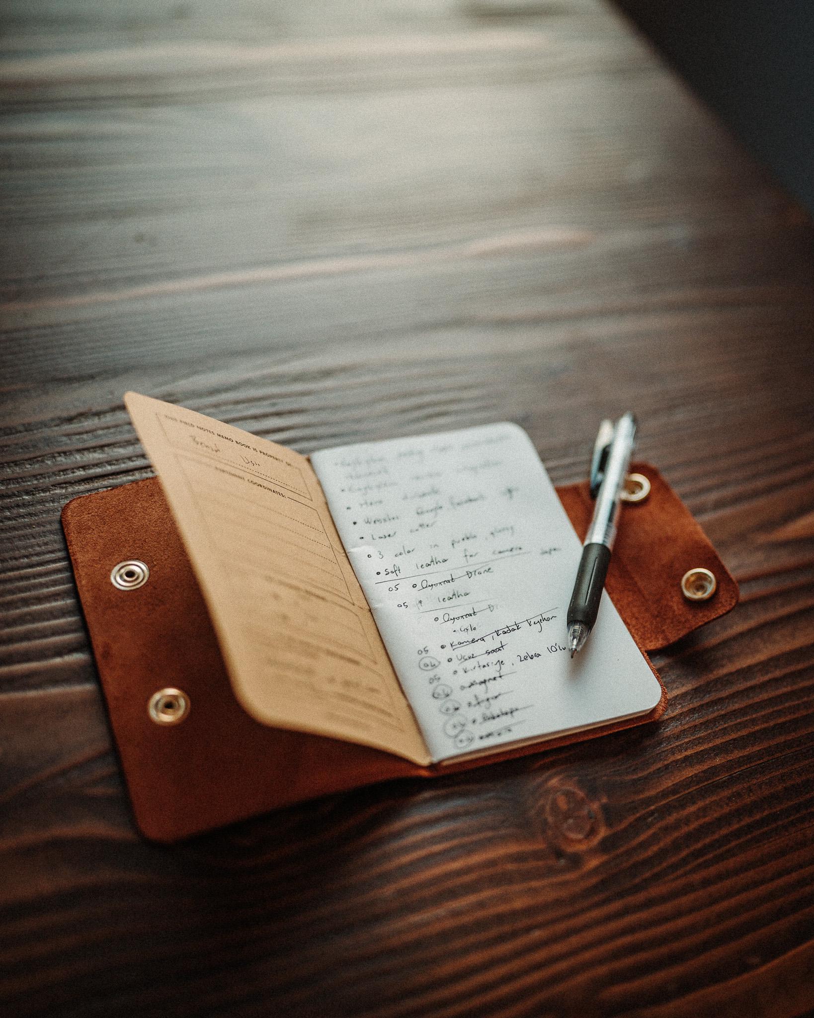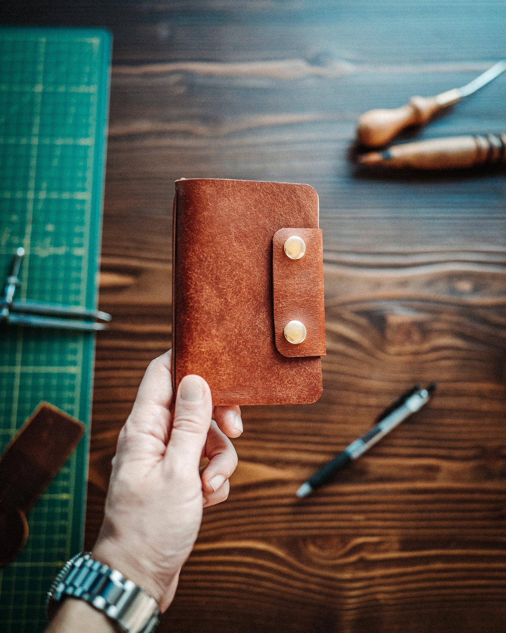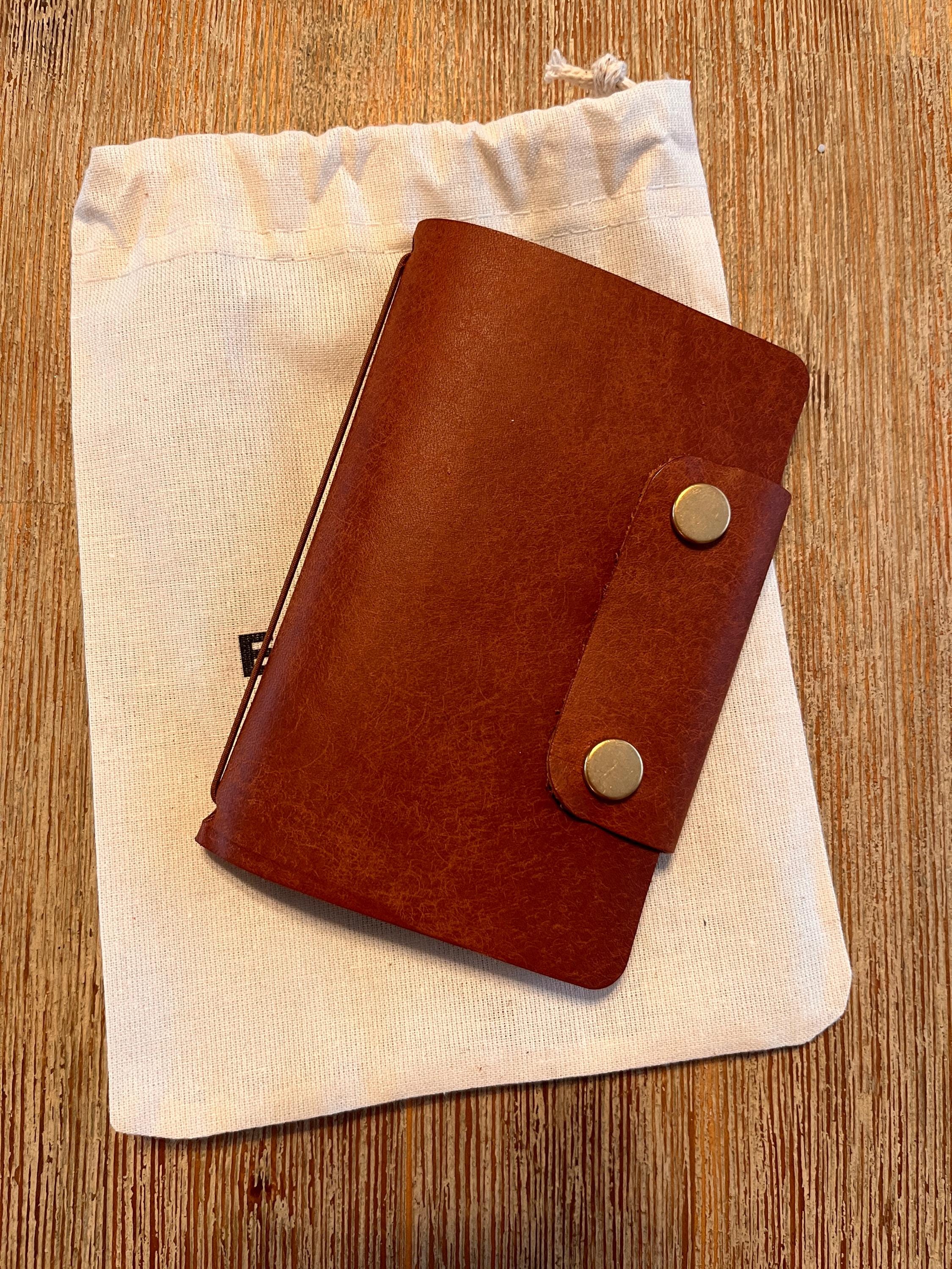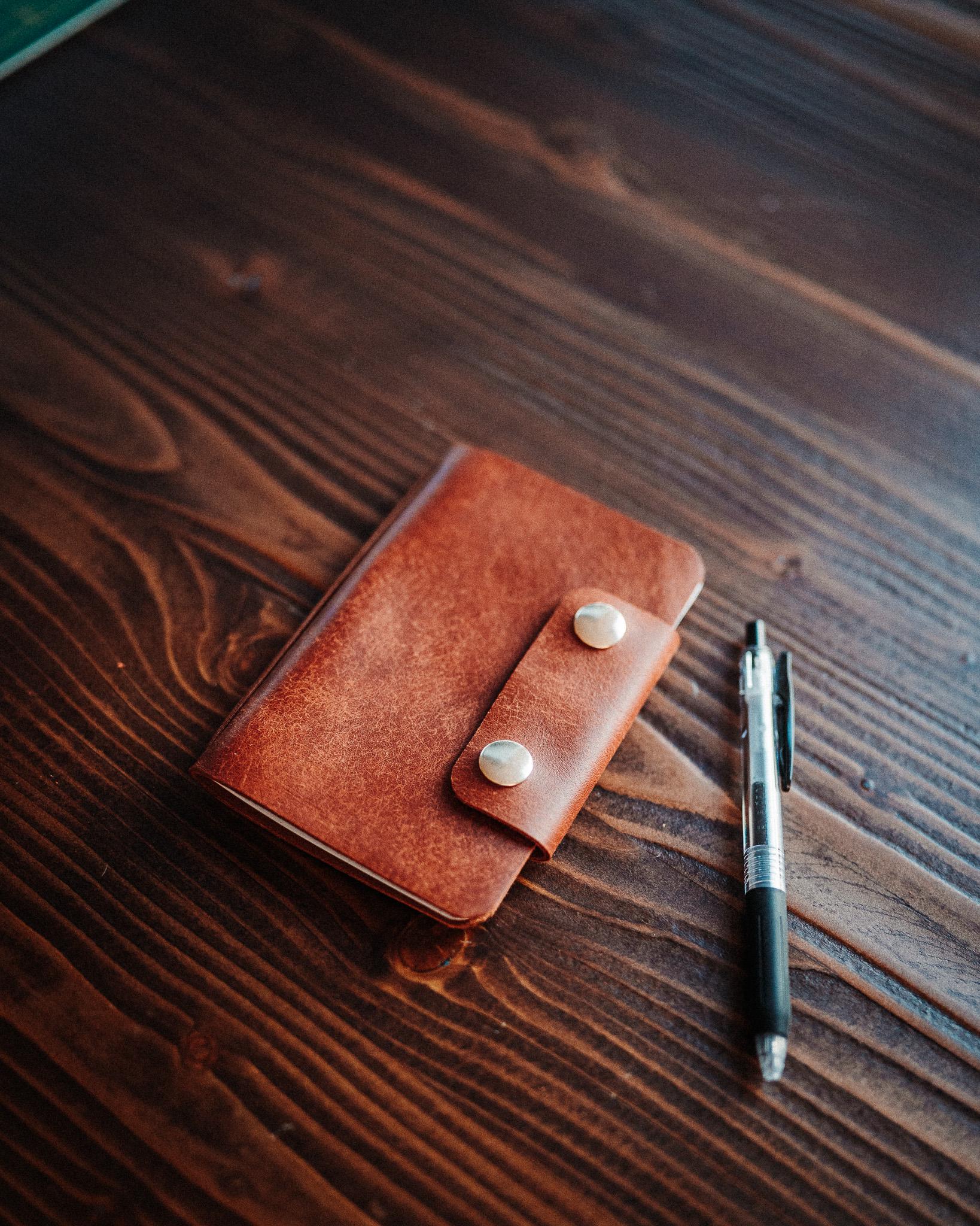 This handmade leather cover is designed for Field Notes notebooks (9x14 cm / 3.5"x5.5"). Crafted from full grain pueblo leather, it features a secure snap closure and a dedicated pen compartment for everyday convenience.