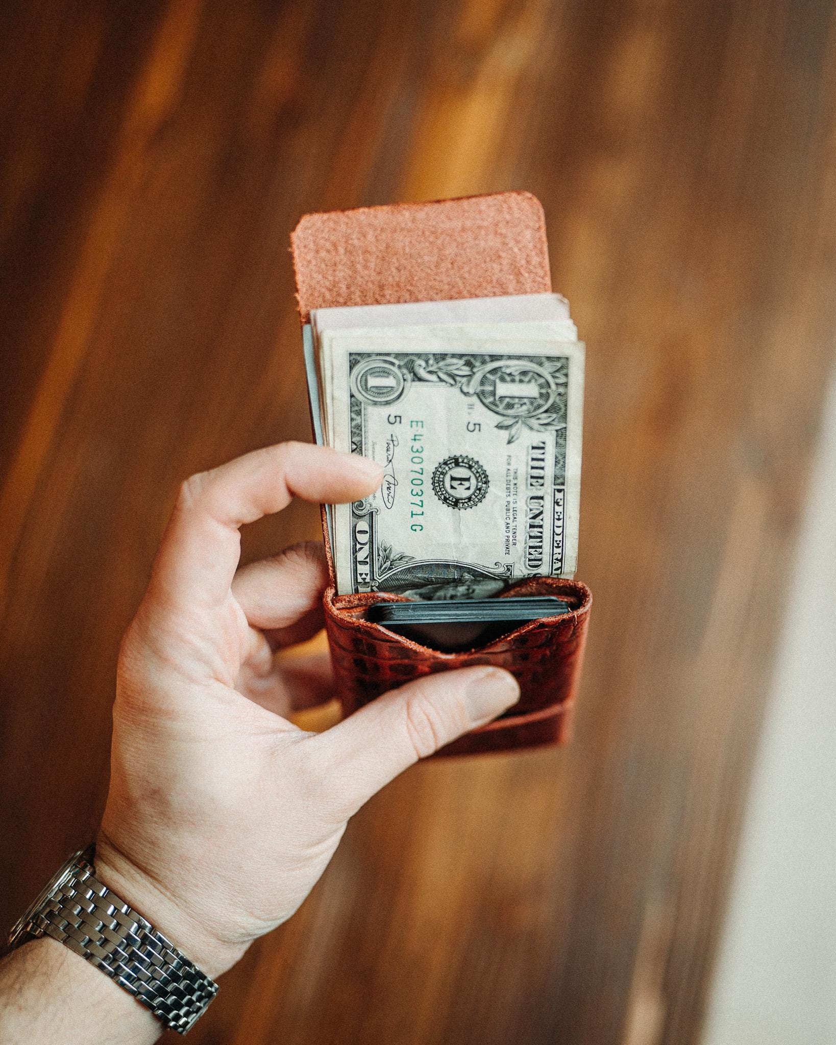 A dedicated cash compartment keeps folded bills secure and accessible — comfortably fitting full-size notes with a single fold, without affecting the slim profile.